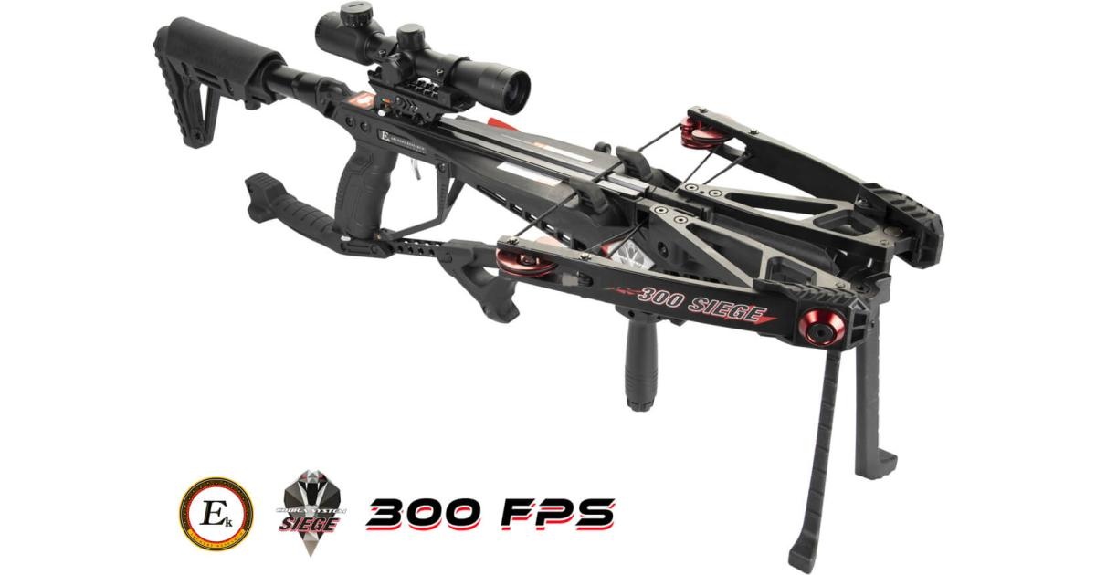 La EK Archery Siege 300 es una ballesta táctica con la que, gracias al ingenioso mecanismo de armado, es posible disparar saetas con poco esfuerzo y en un tiempo de armado más corto. Otras características especiales de la ballesta son que la potencia es ajustable y es posible cambiar el cable y la cuerda sin necesidad de presionar el arco. Si el peso de tracción de 150 libras es demasiado pesado para usted, el peso de tracción se puede reducir hasta 115 libras .