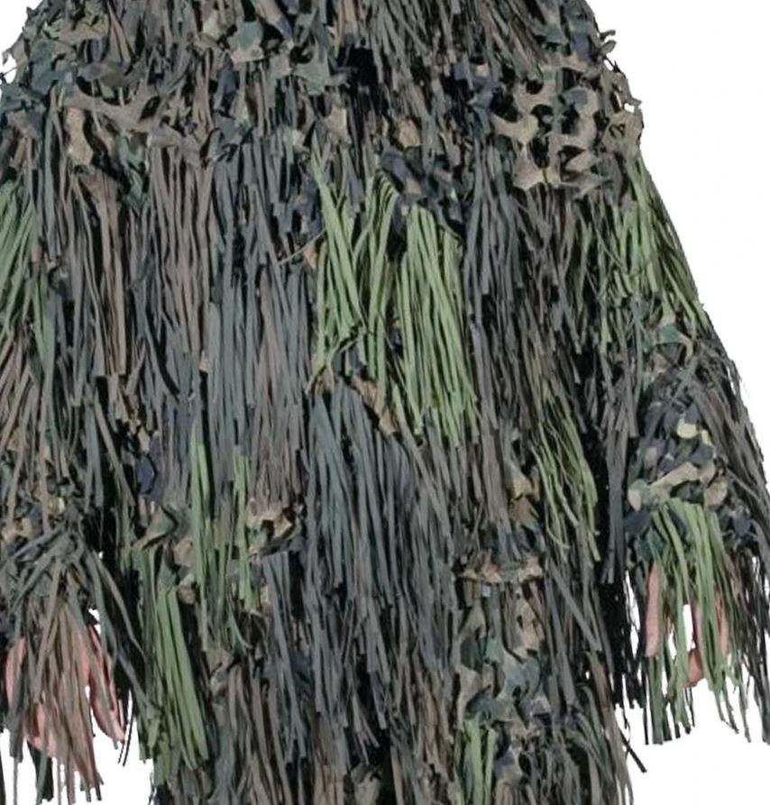 Este Ghillie de Camo Systems tiene un diseño tridimensional. El traje de camuflaje es silencioso debido al material seleccionado, no susurra y tiene protección contra los rayos UV. El material es resistente a la intemperie y al moho, ignífugo e impermeable.
