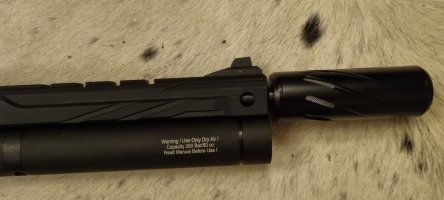 O moderador Huggett Atom 1/2-20 UNF é particularmente poderoso por seu tamanho compacto (89 mm de comprimento e 31 mm de diâmetro) e suprime rifles de ar comprimido de até 16 joules (12 pés/lbs).